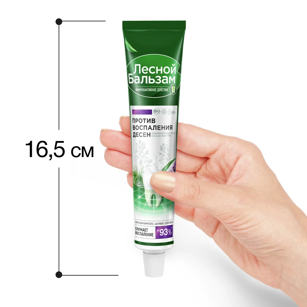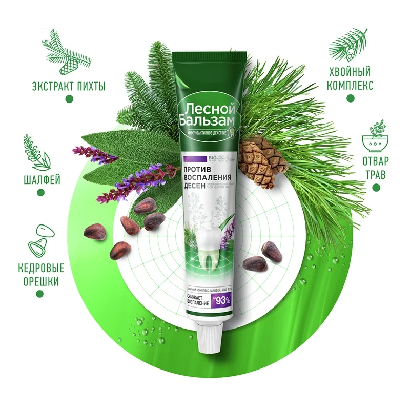 Профилактическая зубная паста Лесной бальзам на отваре трав с иммуноактивным действием помогает решить проблему воспаления десен и в 2 раза улучшает работу собственного иммунитета полости рта, снижая риск развития проблем с деснами.