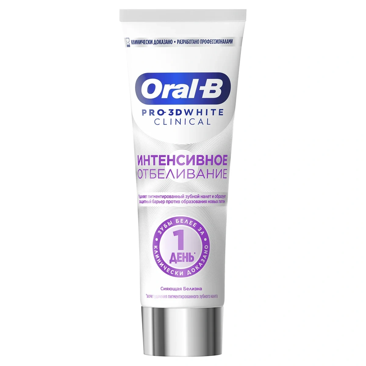 Клинически доказано, что зубная паста Oral-B Pro 3D White Clinical Intensive Whitening обеспечивает белизну зубов за 1 день за счет удаления поверхностных пятен. Она разрыхляет пятна без чистки, удаляет пятна с помощью ионного отбеливания, защищает зубы от будущих пятен и подходит для чувствительных зубов.