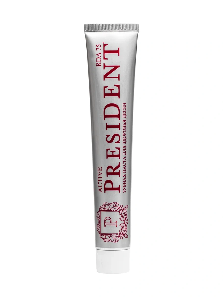 Зубная паста President Active RDA 75 рекомендована для профилактики кровоточивости десен, при пародонтозе и пародонтите. Лактат цинка и боярышник обладают вяжущим действием, подавляют рост патогенных бактерий. Сангвинария способствует снижению кровоточивости. Аллантоин укрепляет десны.