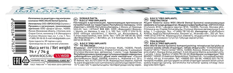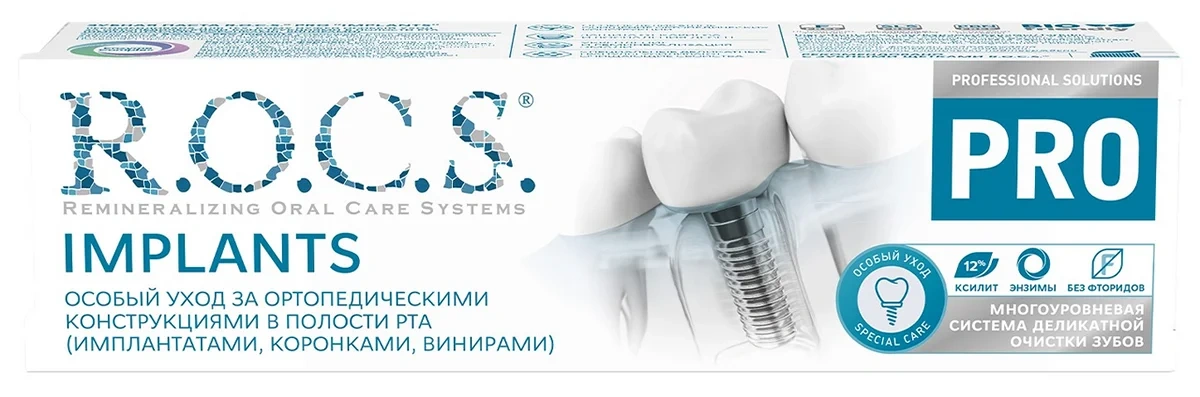 Бренд R.O.C.S. - продукция марки, созданная в современной лаборатории, производится из сырья самого высокого качества. Зубная паста Pro Implants - уменьшает риск возникновения заболеваний в полости рта, которые могут быть связаны с наличием ортопедических конструкций (имплантаты, коронки, виниры). Позволяет пролонгировать период качественной эксплуатации и сохранить их внешний вид. Современная зубная паста R.O.C.S. Pro Implants относится к группе профессиональных специализированных средств, обеспечивающих эффективную гигиену полости рта при наличии особых условий. В случае R.O.C.S. Pro Implants данными условиями являются различные ортодонтические, ортопедические и иные внутриротовые конструкции (включая импланты, коронки, виниры). Данные конструкции существенно затрудняют всестороннюю очистку зубов, что, в свою очередь, может стать причиной воспаления десен, образования кариеса и так далее.