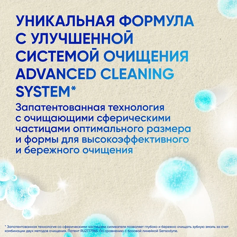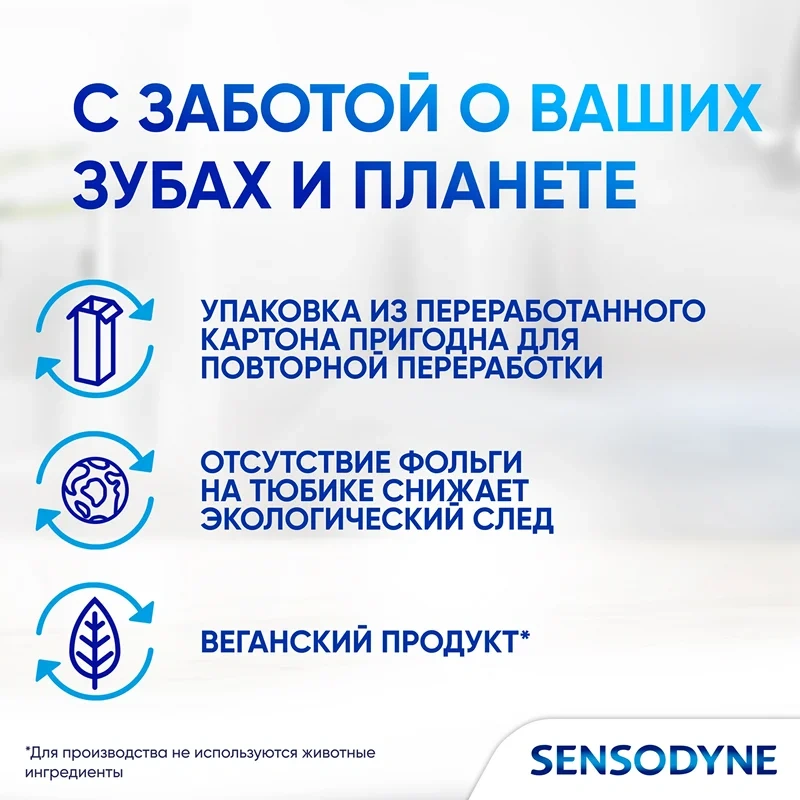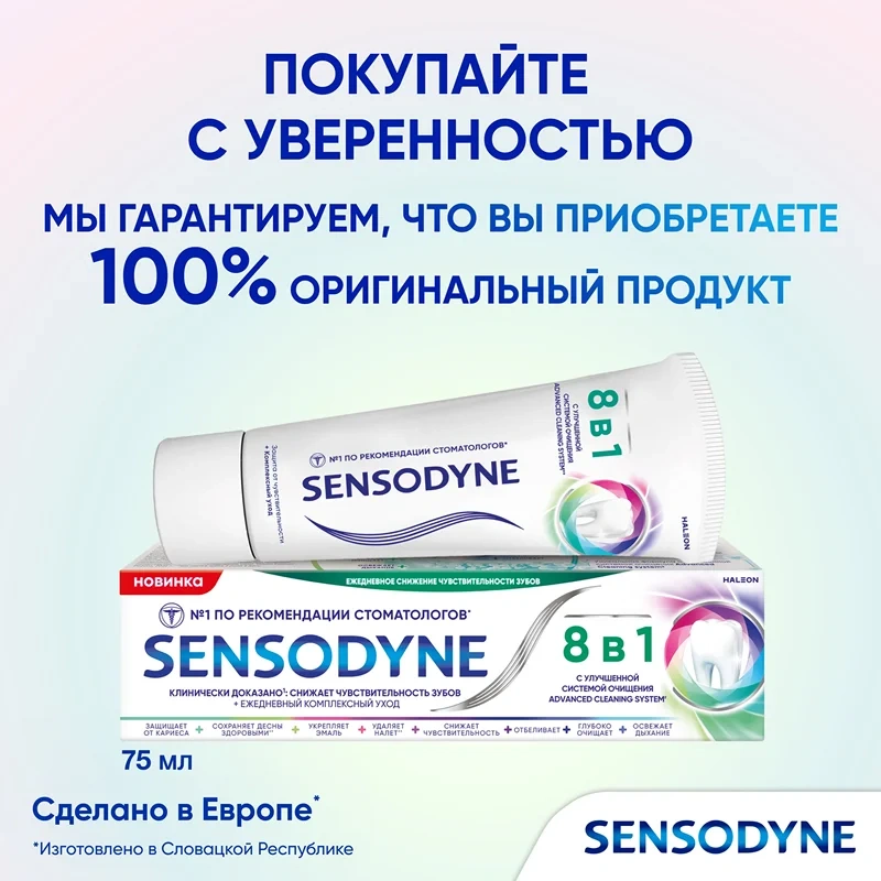 Ежедневное снижение чувствительности зубов. Никаких компромиссов в уходе за зубами: 8 полезных действий в одной зубной пасте. Ежедневный комплексный уход за полостью рта для чувствительных зубов. Зубная паста Sensodyne 8 в 1 - это клинически доказанная защита от чувствительности зубов в сочетании с многочисленными преимуществами по уходу за полостью рта.
