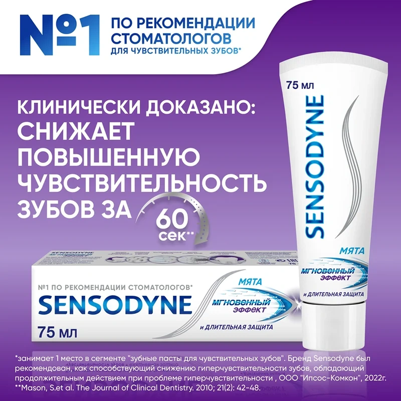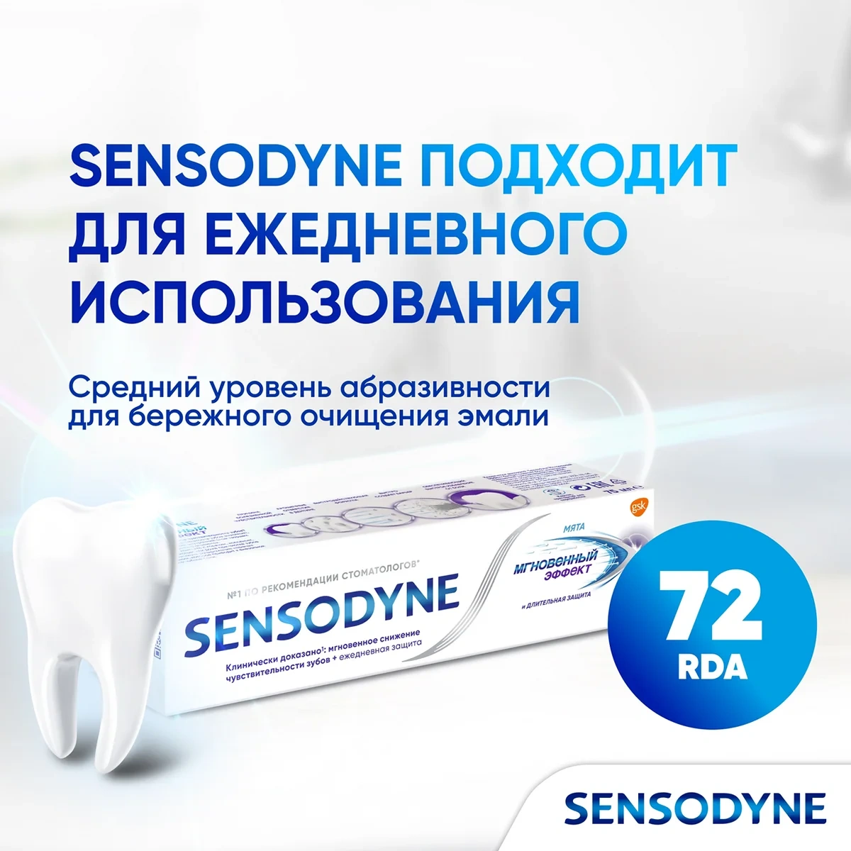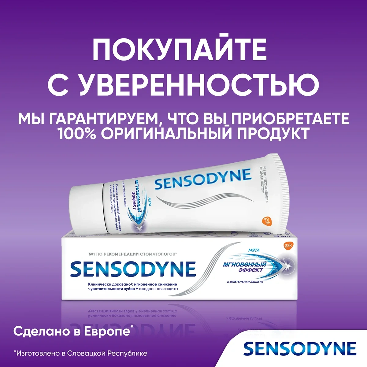 Sensodyne - бренд No1 по рекомендации стоматологов для ухода за чувствительными зубами. Зубная паста Сенсодин Мгновенный Эффект для чувствительных зубов обладает всеми преимуществами гигиены полости рта, которые вам необходимы: Клинически доказано: действует через 60 секунд, обеспечивая длительную защиту для чувствительных зубов. Создает изолирующий слой на поверхности дентина и внутри дентинных канальцев. При чистке зубов 2 раза в день паста Sensodyne Мгновенный Эффект также защищает от кариеса благодаря содержанию фтора.