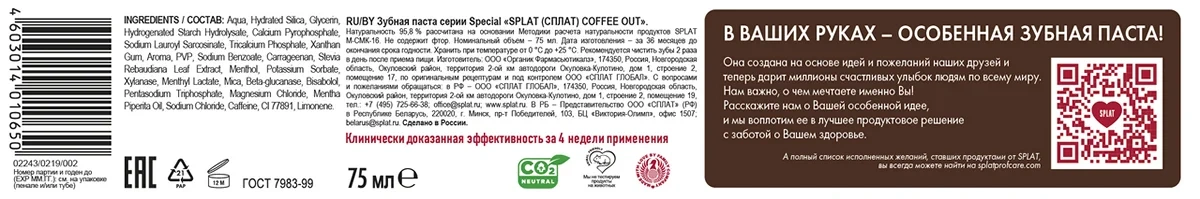 Зубная паста Splat Coffee Out для эффективного осветления эмали, 75мл