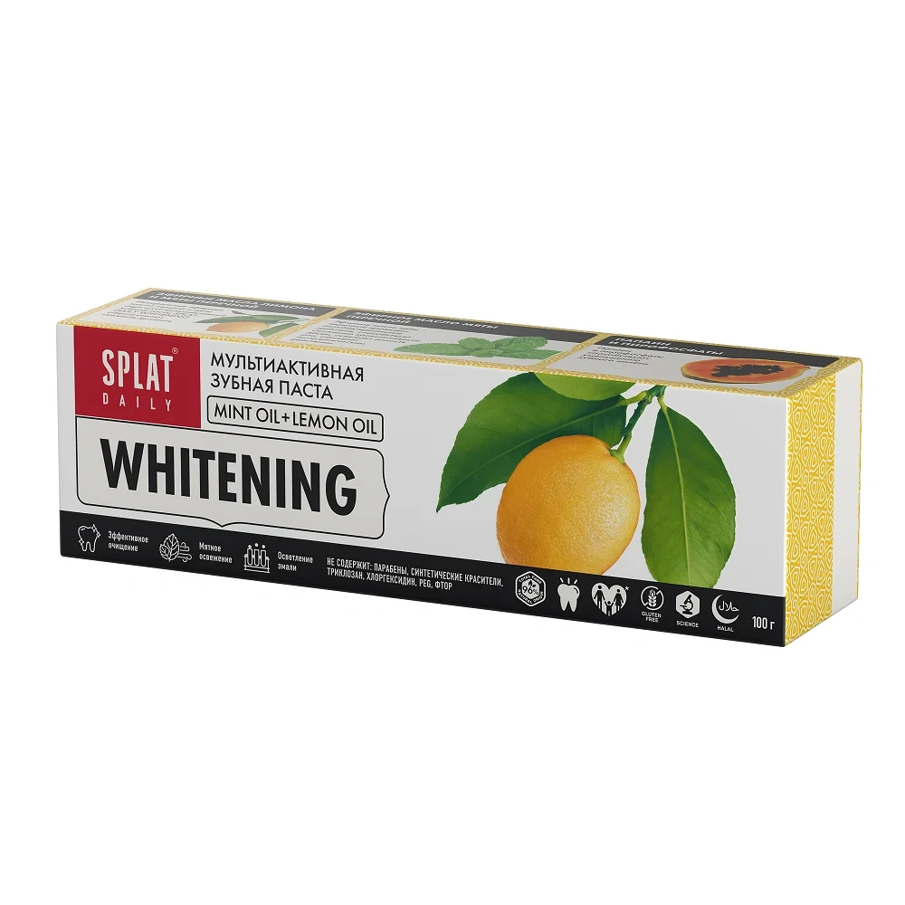 Мультиактивная зубная паста Mint oil+ lemon oil Whitening. Эффективное очищение. Мятное освежение. Осветление эмали. Содержит: Эфирные масла лимона и мяты перечной. Натуральные эфирные масла лимона и мяты перечной мультиактивной зубной пасты splat daily whitening обеспечивают свежесть дыхания. Эфирное масло мяты перечной. Эфирное масло мяты перечной проявляет антибактериальное действие, способствует снижению кровоточивости десен, освежает полость рта, обладает антисептическим действием. Папаин и пирофосфаты. Папаин и пирофосфаты способствуют уменьшению зубного налета.