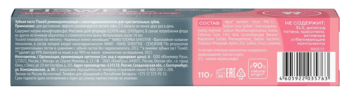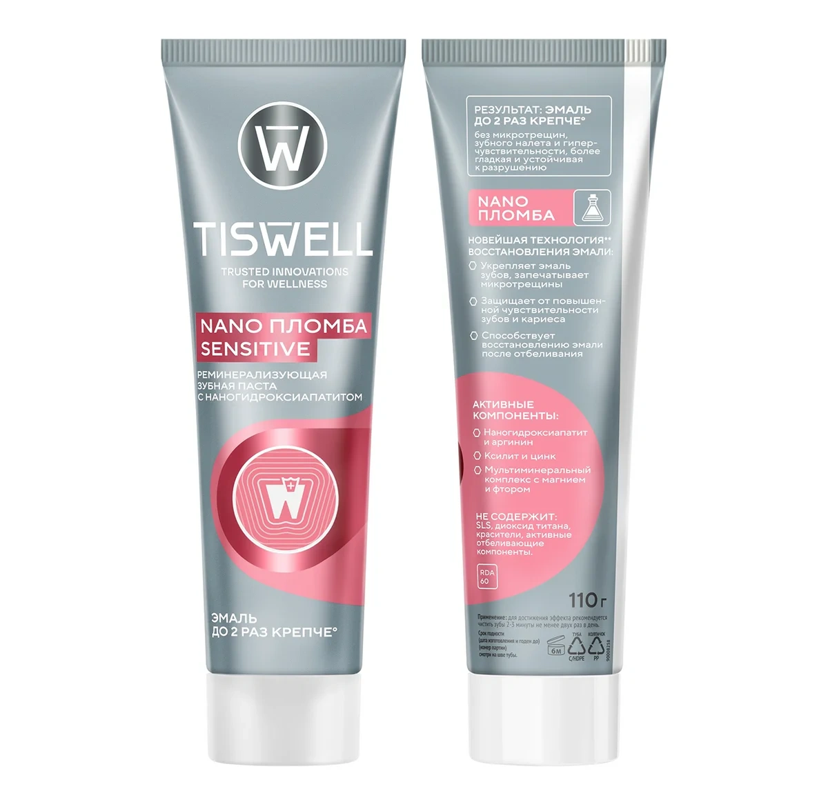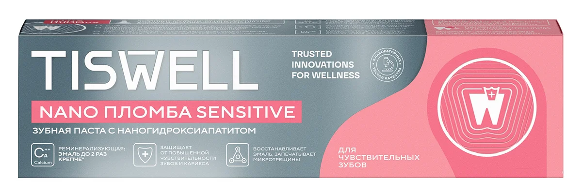 Реминерализирующая зубная паста Tiswell с наногидроксиапатитом – это качественное средство для ухода за чувствительными зубами. Зубная паста с фтором и магнием разработана с применением Nano пломба Sensitive - новейшей технологии восстановления эмали зубов. Nano пломба с наногидроксиапатитом и аргинином с первого применения проникает в ослабленные участки эмали и способствует снижению гиперчувствительности зубов. Зубная паста с ксилитом Tiswell действует подобно пломбе: заполняет микротрещины и восстанавливает микроповреждения эмали.