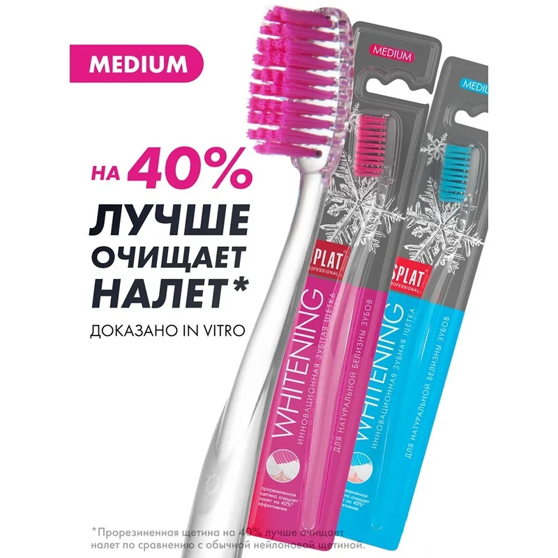 Зубная щетка, отбеливающая Whitening, средняя/medium Прорезиненная щетина зубных щеток Whitening на 40% эффективнее отбеливает зубы, чем обычная нейлоновая, что подтверждено клиническими исследованиями. Специальное покрытие каждой щетинки позволяет аккуратно и эффективно очищать налет, как будто ластик стирает карандаш с белого листа бумаги. Закругленные кончики щетинок гарантируют, что процесс чистки будет безопасным. Зубные щетки Сплат вайтининг созданы для достижения снежно-белого оттенка зубной эмали, именно поэтому снежинка является символом серии.
