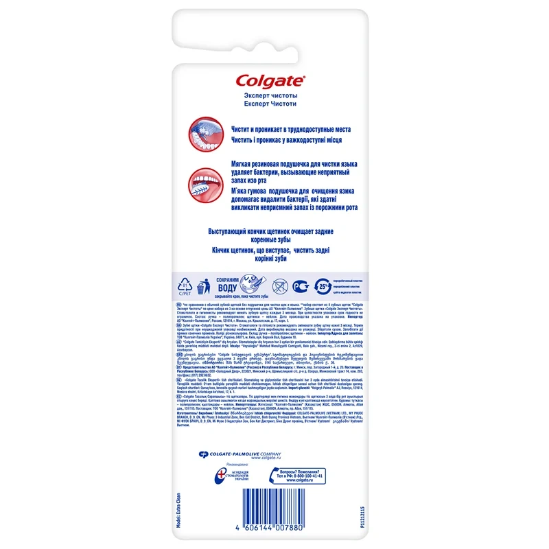 С зубными щетками Colgate Эксперт чистоты 3+1 средней жесткости вы ощутите чистоту всей полости рта. С помощью выступающих кончиков щетинок она интенсивно очищает задние коренные зубы, наиболее подверженные кариесу. Подушечка для чистки языка удаляет бактерии, вызывающие неприятный запах изо рта. Обеспечивают полную очистку полости рта, очищая зубы, язык, щеки и десны по сравнению с обычной зубной щеткой без очистителя языка и щек. Ручка зубной щетки состоит из 25% переработанного пластика.