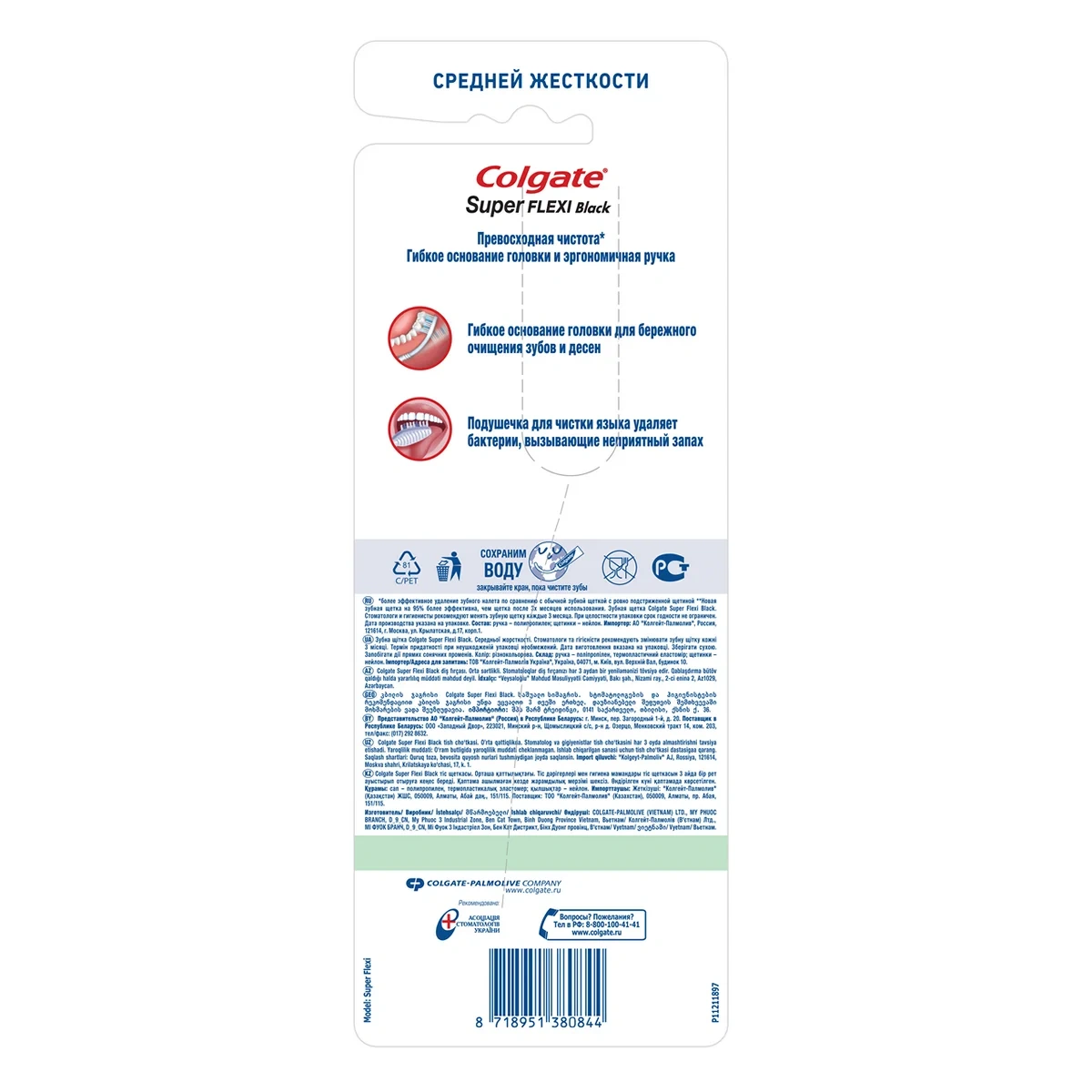 Отличается от остальных щеток своей гибкой головкой, которая оказывает меньше давления на дёсны, при этом сохраняя качество чистки. В набор Colgate Супер Флекси блэк входит 4 зубные щетки разных цветов для нескольких человек в семье или для пополнения запасов, позволяя постоянно заботиться о здоровье зубов. Гибкая и эргономичная ручка для чистки труднодоступных уголков рта. Имеет очиститель языка для мягкого удаления налета.4 ярких цвета ручек. Средняя жесткость щетины. Стоматологи и гигиенисты рекомендуют менять зубную щетку каждые 3 месяца. Чистите зубы не менее двух раз в день или по указанию стоматолога или врача. Используйте зубную пасту и щетку Colgate, подходящие для вашей полости рта. Отлично подойдет для эффективного, но при этом бережного очищения ротовой полости. На оборотной стороне головки имеется подушечка для удаления налета и бактерий с языка. Удобная прорезиненная ручка не скользит в руке.
