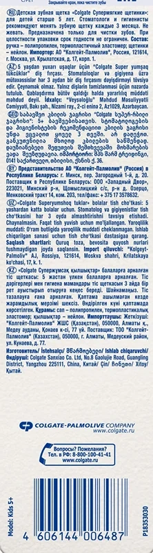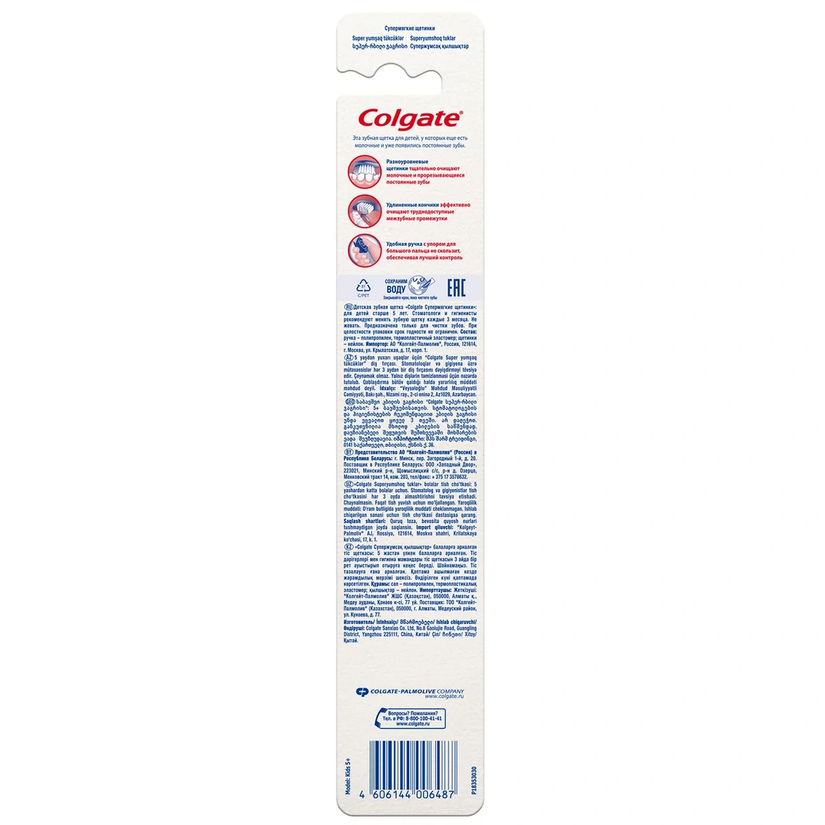 Детская щетка с ультрамягкими щетинками для зубов от Colgate для детей 5+ специально разработана для вашего ребенка. Она идеально подходит для развития навыков гигиены полости рта, через которые проходит любой малыш, а благодаря яркому, привлекательному дизайну зубных щеток ежедневная чистка зубов станет удовольствием для вашего ребенка. Предназначена для тех, у кого еще есть молочные и уже появились постоянные зубки. Подходит для мальчиков и девочек 5 лет и старше. Удлиненные кончики эффективно очищают труднодоступные межзубные промежутки. Стоматологи и гигиенисты рекомендуют менять зубную щетку каждые 3 месяца. Чистите зубы не менее двух раз в день или по указанию стоматолога или врача. Используйте зубную пасту и щетку Колгейт, подходящие для вашей полости рта.