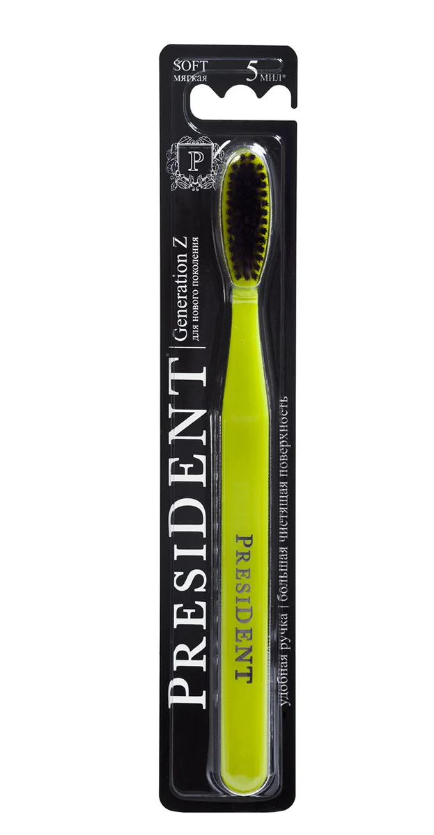 Зубная щетка President Generation Z Мягкая 5 МИЛ для нового поколения (12+) , подходит для качественного ежедневного ухода. Большая головка обеспечивает быстрое очищение внешних, внутренних и жевательных участков зубного ряда. Оптимально закругленные кончики щетины проходят трехуровневую обработку, деликатно полируют зубную эмаль и не травмируют десны. Удобная, эргономичная ручка позволяет соблюдать правильную технику чистки зубов.