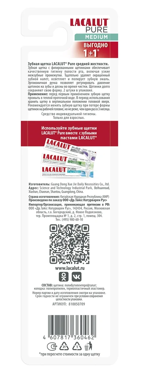 Зубная щетка Lacalut Pure средней жесткости с филированными щетинками обеспечивает качественную гигиену полости рта, включая узкие межзубные промежутки. Тщательно удаляет окрашенный зубной налет, осветляет и полирует зубную эмаль. Эргономичная ручка позволяет регулировать давление щетинок на зубы и десны во время чистки. Щетинки долго сохраняют свою форму. Перед первым применением зубную щетку промыть в теплой проточной воде. В период использования хранить щетку в вертикальном положении головкой вверх. Рекомендуется менять зубную щетку при потере формы щетинок на рабочей головке, но не реже, чем один раз в 3 месяца.