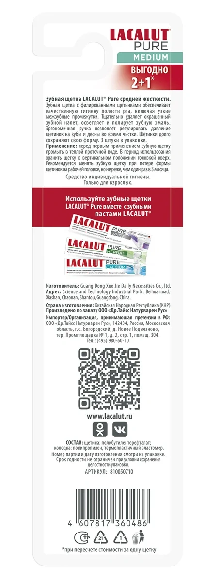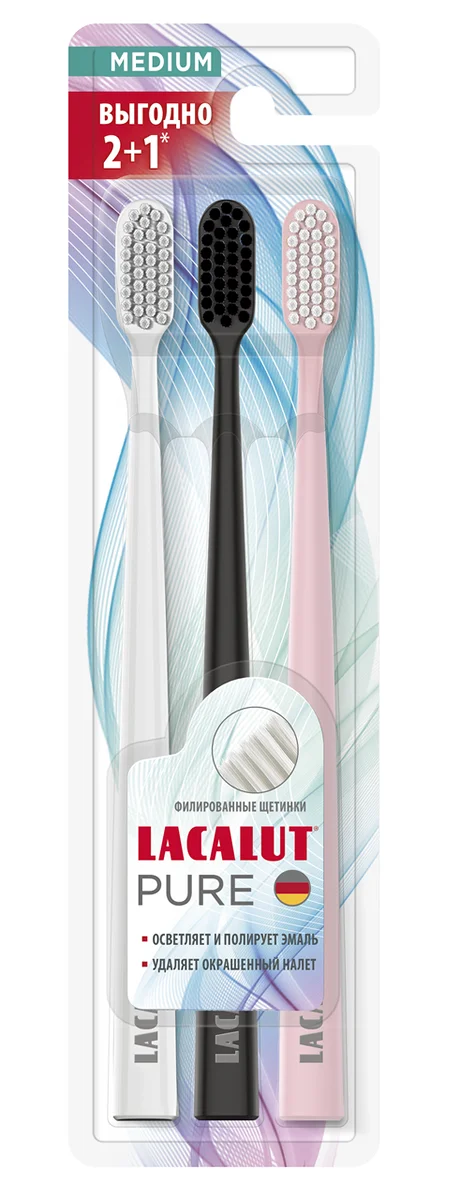Зубная щетка Lacalut Pure средней жесткости с филированными щетинками обеспечивает качественную гигиену полости рта, включая узкие межзубные промежутки. Тщательно удаляет окрашенный зубной налет, осветляет и полирует зубную эмаль. Эргономичная ручка позволяет регулировать давление щетинок на зубы и десны во время чистки. Щетинки долго сохраняют свою форму. Перед первым применением рекомендуется промыть зубную щетку в теплой воде. После каждой чистки зубов необходимо тщательно смыть с зубной щетки остатки пасты под проточной водой и хранить в открытом держателе без использования футляров и колпачков щетинками вверх. Рекомендуется менять зубную щетку при потере формы щетинок, после болезни и проведения профессиональной гигиены, но не реже, чем один раз в 3 месяца.