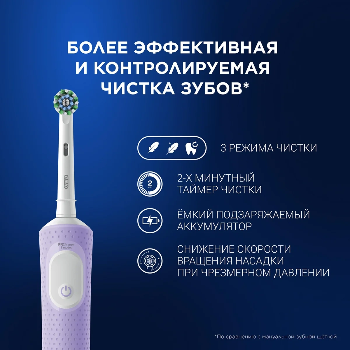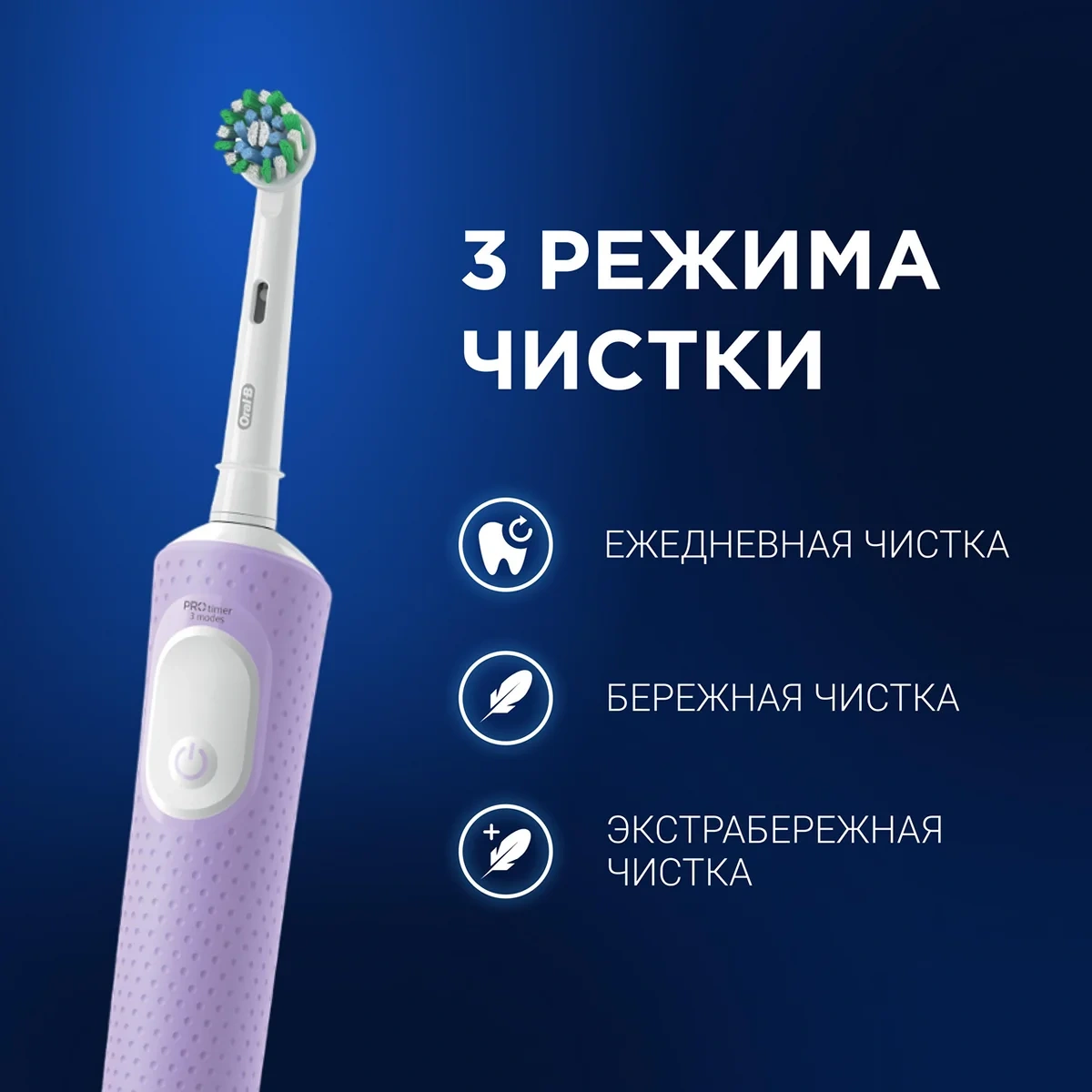 Электрическая зубная щетка Oral-B Vitality Pro поможет вам поддерживать гигиену полости рта намного эффективнее обычной зубной щетки. Новое поколение зубных щеток Vitality PRO имеет 3 режима, включая режим чистки Sensitive Plus для невероятно бережного очищения полости рта и мягко удаляет до 100% больше налета по сравнению с мануальной щеткой. Встроенный таймер оповестит вас о завершении 2-х минутной процедуры чистки. Сделайте выбор в пользу Oral-B - марки зубных щеток №1, используемой большинством стоматологов в мире. Особенности модели: - Возвратно-вращательная технология чистки 2d от Oral-B: щётка вибрирует и крутится, удаляя до 100% больше налета по сравнению с обычной щёткой; - 3 режима чистки: ежедневная чистка, бережная чистка и уникальный режим Sensitive Plus для невероятно бережной чистки; - Таймер с функцией оповещения о необходимости смены зоны чистки зубов; - Заряжаемый аккумулятор для длительной автономной работы щетки. В комплекте: сменная насадка Oral-B Cross Action с щетинками, меняющими цвет от зеленого до желтого, подсказывая, когда ее пора заменить, 1 зарядное устройство, гарантийный талон и инструкция.