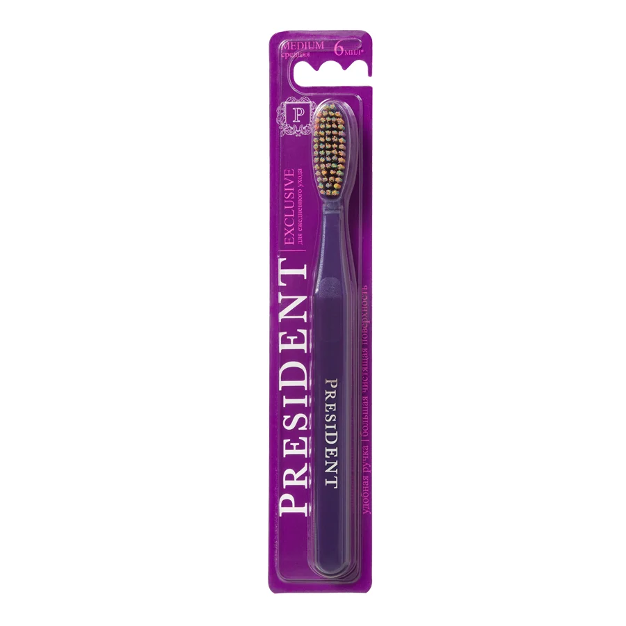 Средняя зубная щетка President Exclusive 6 МИЛ подходит для качественного ежедневного ухода. Большая головка обеспечивает быстрое очищение внешних, внутренних и жевательных участков зубного ряда. Оптимально закругленные кончики щетины проходят трехуровневую обработку, деликатно полируют зубную эмаль и не травмируют десны. Удобная, эргономичная ручка позволяет соблюдать правильную технику чистки зубов.