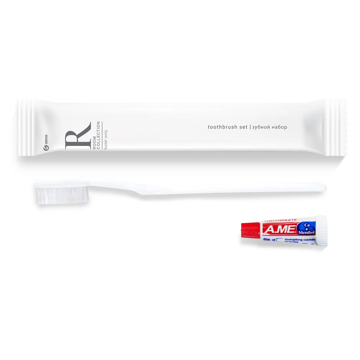 Предназначен для гигиены полости рта и подходит для использования в гостиницах, апартаментах и в поездках. В состав входят зубная щётка длиной 18 см и зубная паста объёмом 6 г в тюбике. Изделия упакованы в индивидуальные флоупаки из полиэтилена.